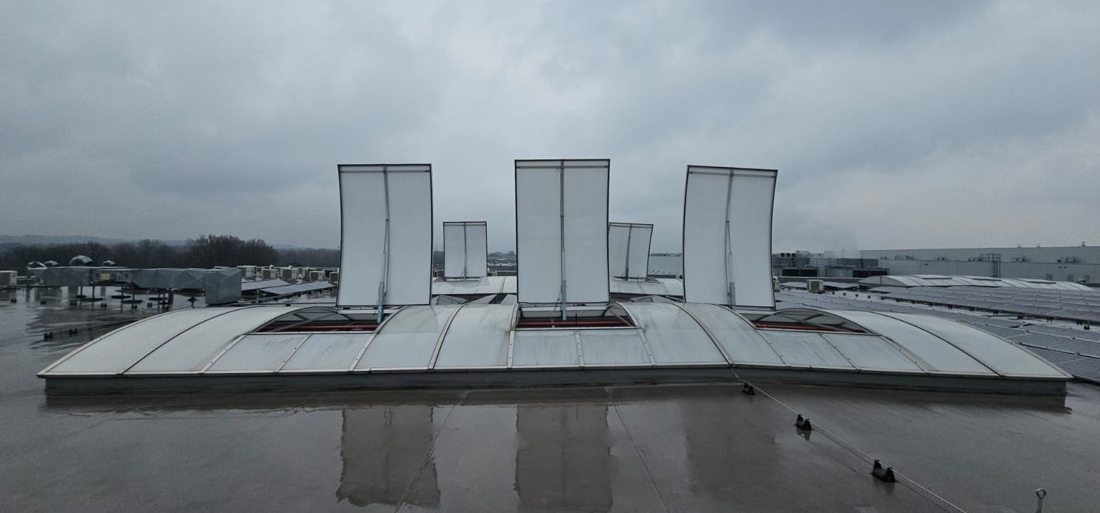 Nedávno sme v noci vyrážali na urgentný servisný zásah. Silný vietor vylomil elektromotor a svetlík zostal otvorený dokorán. V hale to znamenalo jediné – prievan, neporiadok a riziko ďalšieho poškodenia.