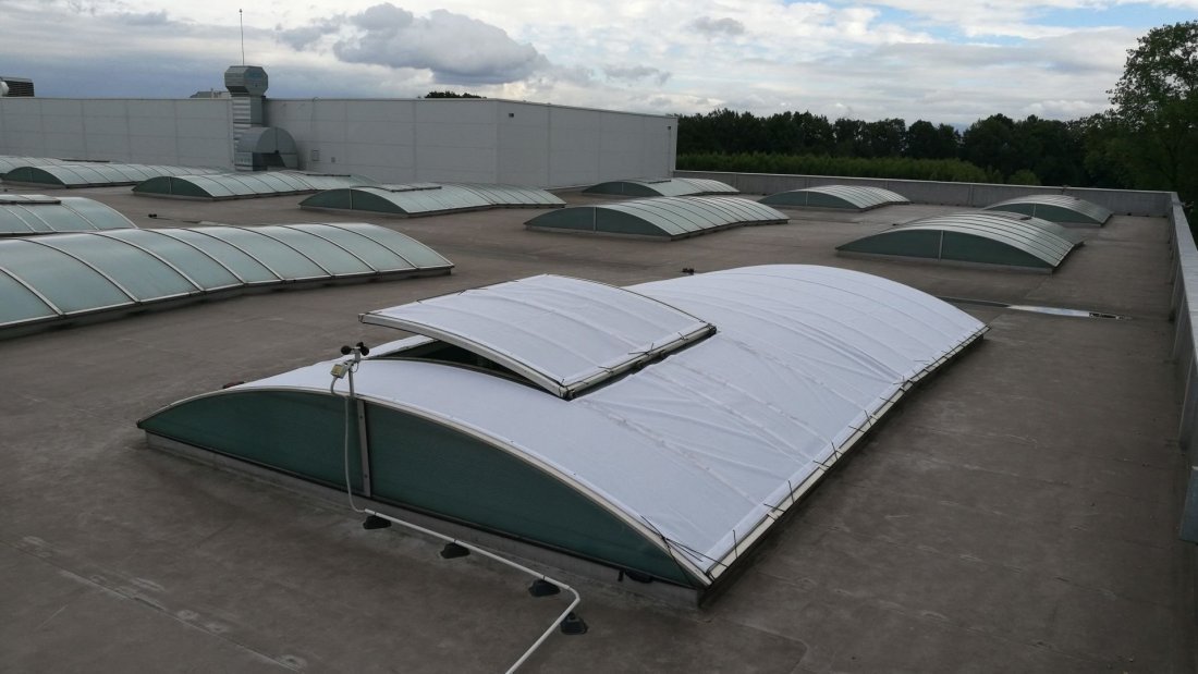 Prvá realizácia tienenia svetlíkov ABB v roku 2016 – odolná protislnečná tkanina chráni halu pred prehrievaním.